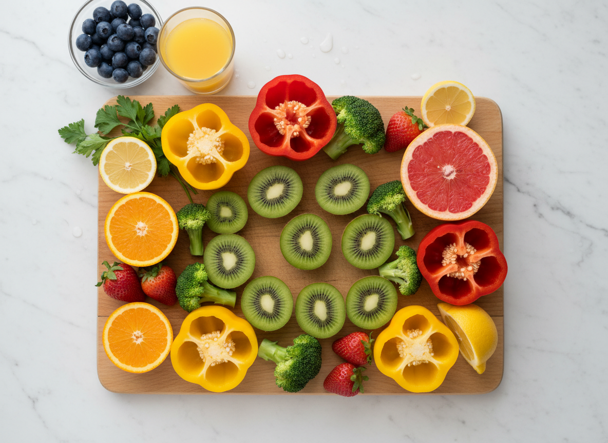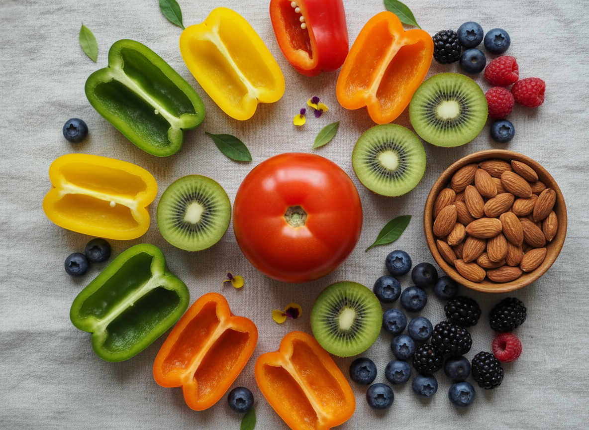 | 키위, 파프리카, 브로콜리 | 비타민 C | 멜라닌 생성 억제, 콜라겐 합성 촉진 |