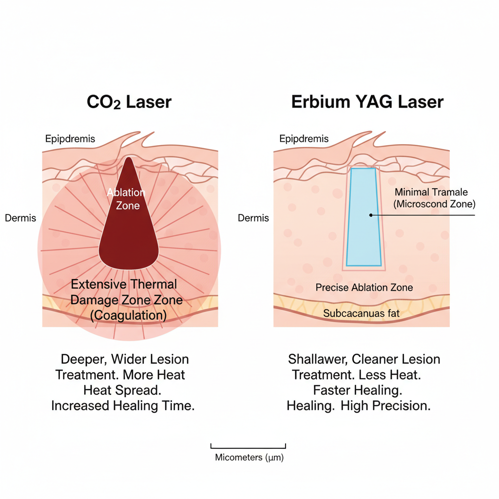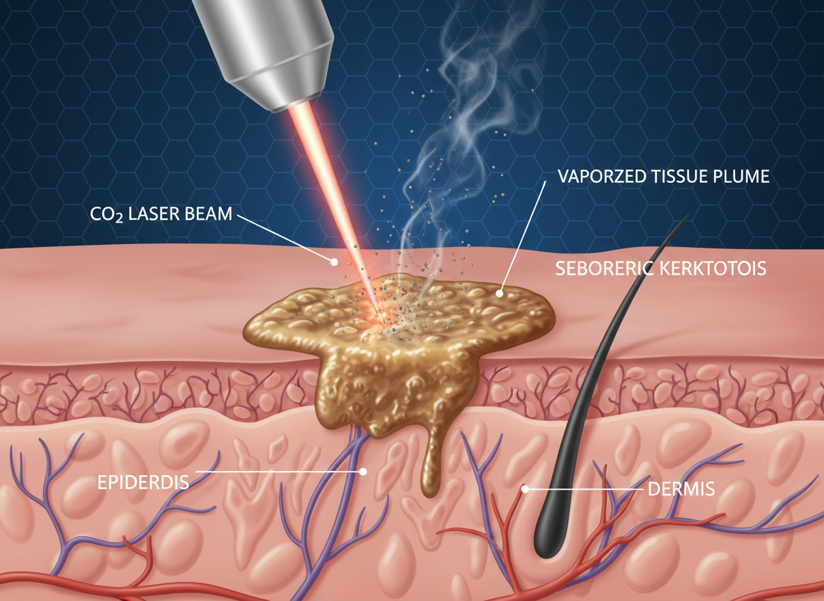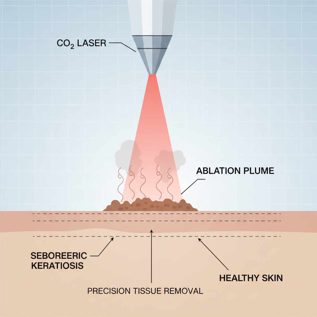 - CO2 레이저 (이산화탄소 레이저): 점을 뺄 때도 많이 쓰는 아주 대중적인 레이저예요. 피부 겉면으로 볼록하게 튀어나온 두꺼운 검버섯을 정밀하게 깎아내는 데 탁월한 효과가 있습니다. 시술 후 딱지가 생기며, 관리가 잘 되어야 흉터를 막을 수 있어요.