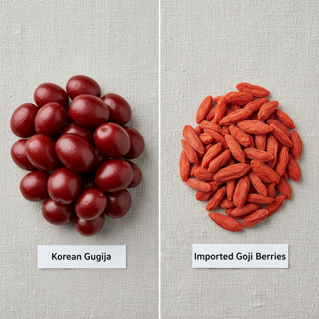 A: 국산 구기자는 대체로 알이 크고 검붉은 색을 띠며 과육이 쫀득한 느낌이 있습니다. 반면 중국산은 크기가 작고 색이 선명한 붉은색이며, 건조 상태가 딱딱한 경우가 많습니다. 씨앗의 크기도 국산이 더 큰 편입니다.