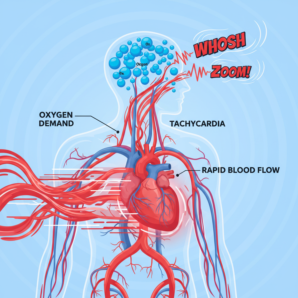- 혈류량 증가(빈혈, 임신, 갑상선 항진증): 혈관 자체는 튼튼해도 흐르는 피의 양이 너무 많거나 속도가 빨라지면 소리가 납니다. 빈혈이 심하면 우리 몸은 부족한 산소를 공급하기 위해 심장을 더 빨리, 세게 뛰게 만듭니다. 마치 엔진을 과열시키는 것과 같죠. 이때 발생한 거친 혈류음이 귀에 잡히게 됩니다.