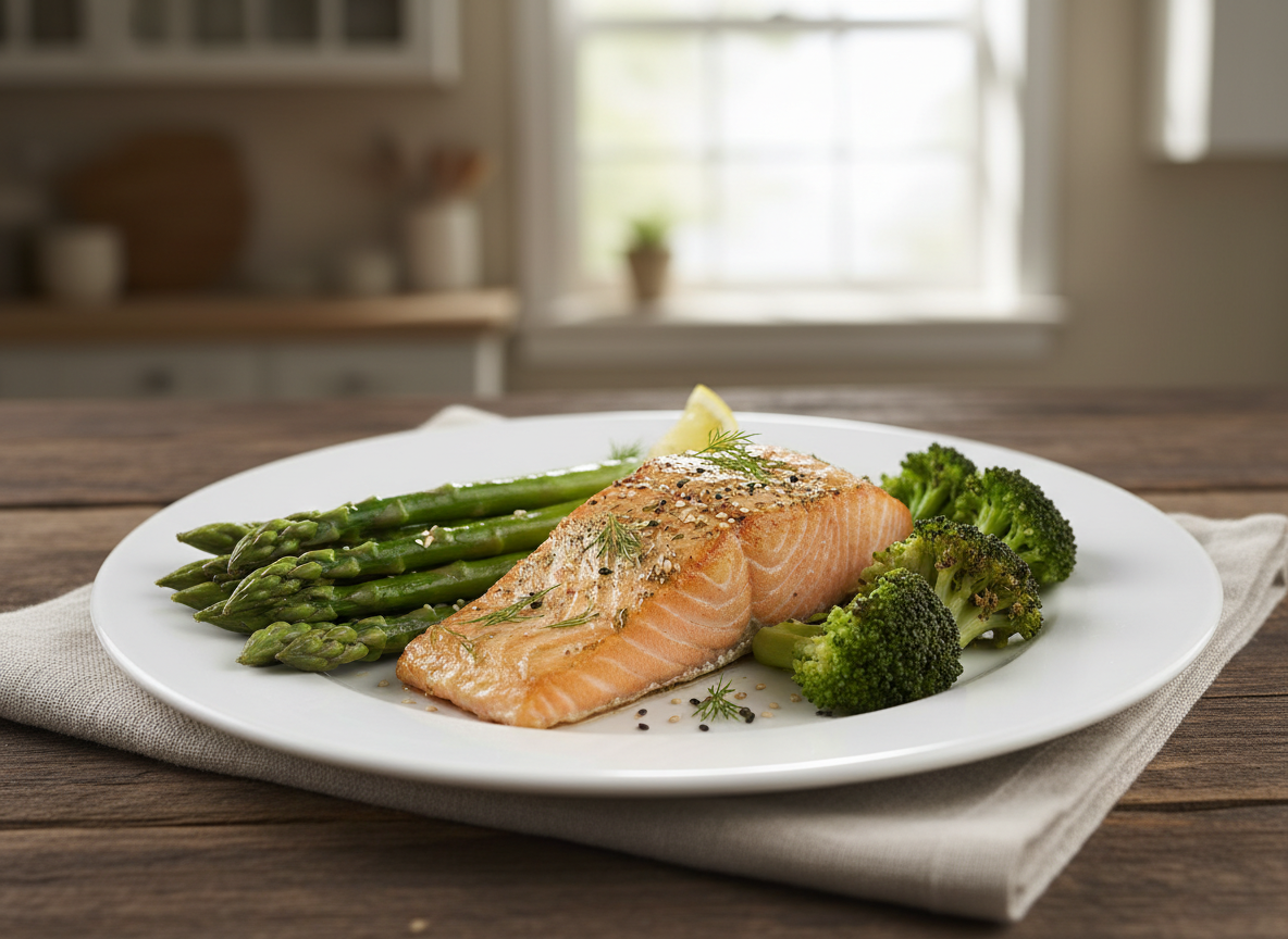 - 저녁: 데친 아스파라거스와 브로콜리를 곁들인 연어 스테이크