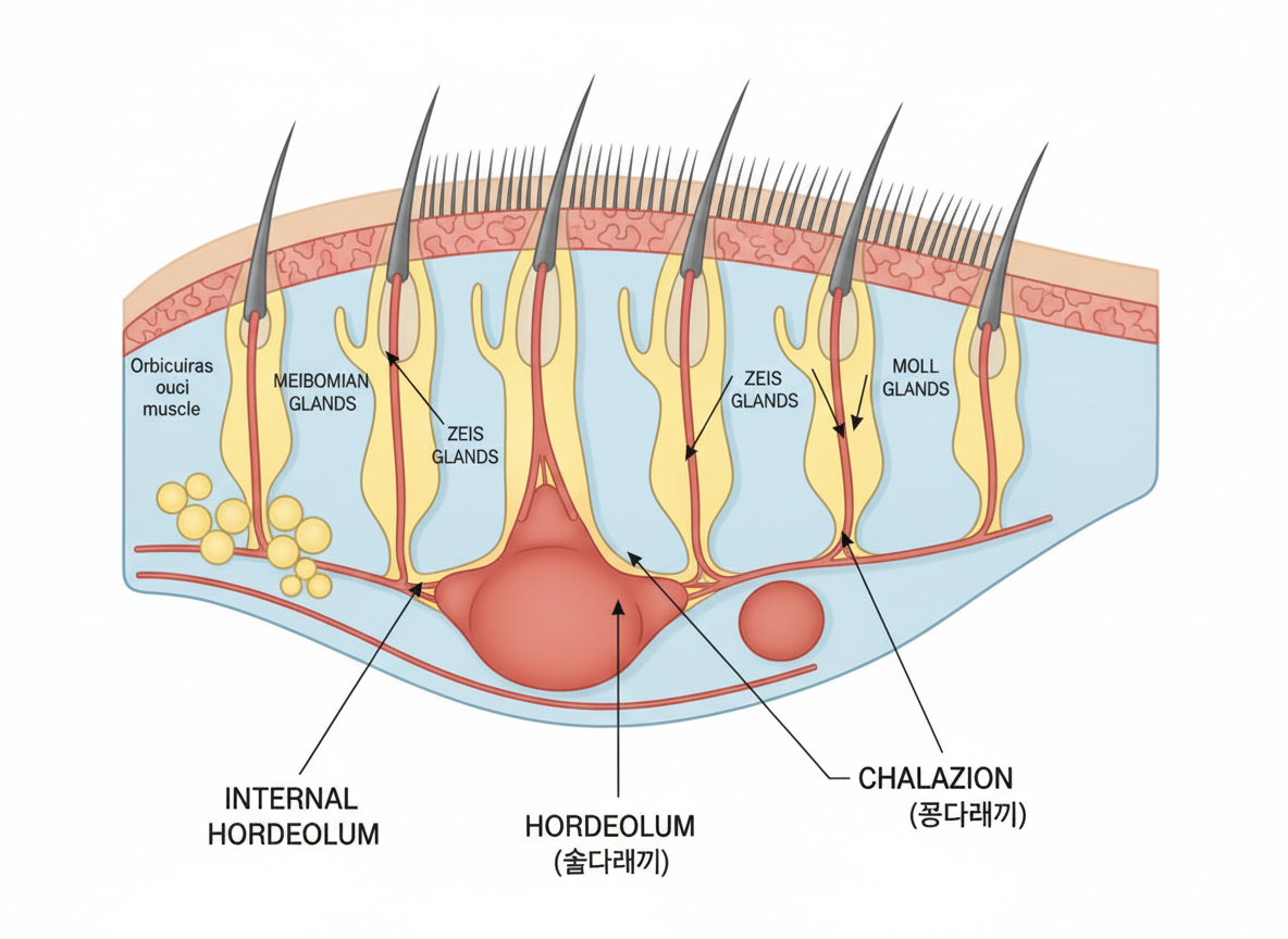 - 속다래끼: 눈꺼풀 안쪽 마이봄샘에 생기며, 겉으로 잘 안 보여 더 아프게 느껴지기도 합니다.