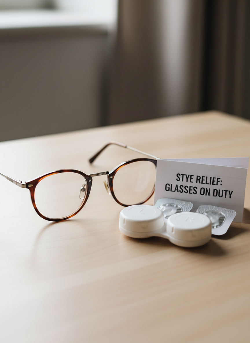 A: 다래끼 있는 동안 렌즈 착용은 중단하고 안경을 쓰세요. 렌즈 착용은 감염 악화 및 자극을 줄 수 있어, 완치될 때까지 삼가야 합니다.