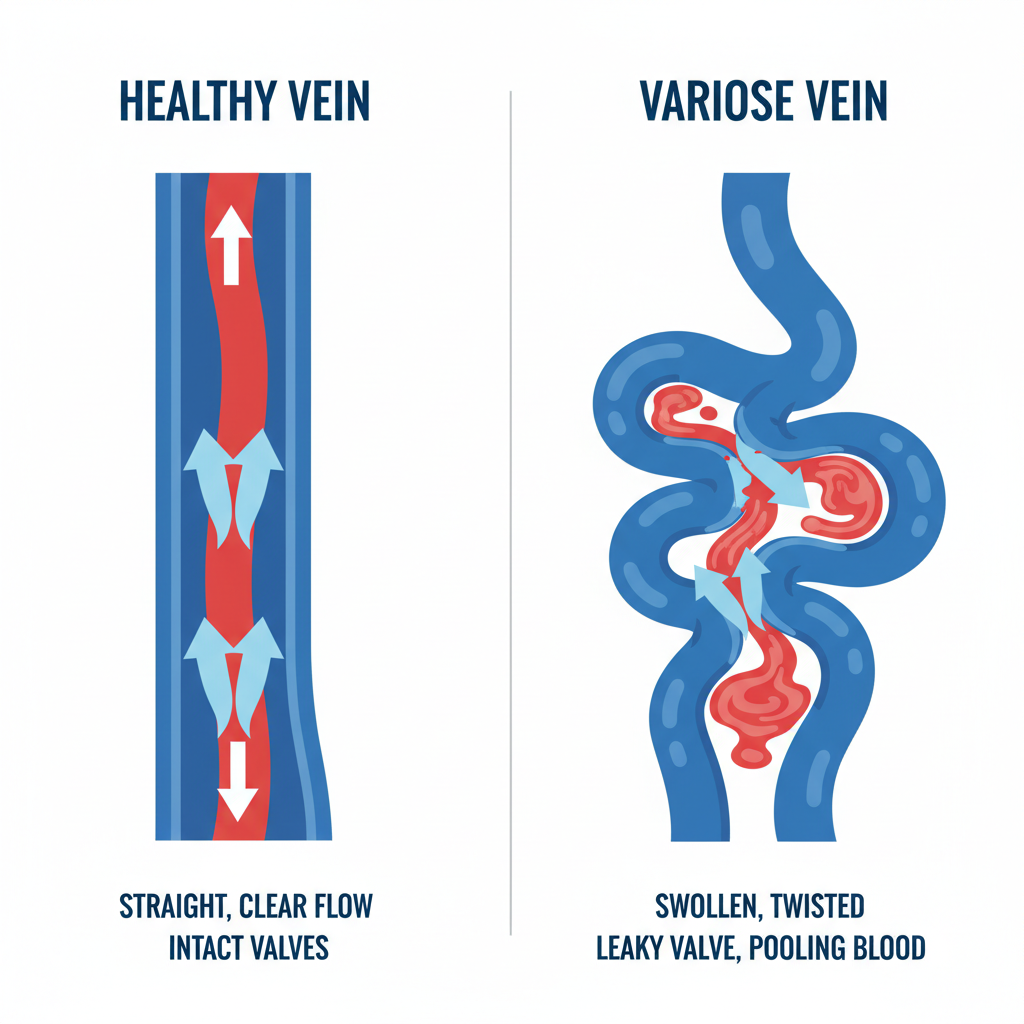 물론 혈액순환 문제도 배제할 수는 없습니다. 하지만 우리가 흔히 생각하는 '피가 안 통하는 느낌'과는 조금 다릅니다. 하지정맥류는 정맥 내 판막이 고장 나 심장으로 가야 할 혈액이 다리에 고이는 현상입니다.