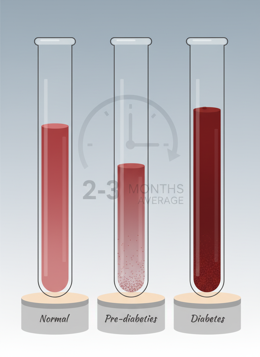 당화혈색소(HbA1c)는 혈액 속의 헤모글로빈이 얼마나 많은 포도당과 결합했는지를 보여주는 지표예요. 우리가 흔히 아는 혈당 수치는 검사 시점의 혈당을 보여주지만, 당화혈색소는 지난 2~3개월간의 평균 혈당 수치를 반영하기 때문에 훨씬 더 장기적인 혈당 조절 상태를 알 수 있게 해주죠. 한마디로, 혈당 관리에 대한 우리 몸의 '성적표' 같은 거라고 할 수 있어요.