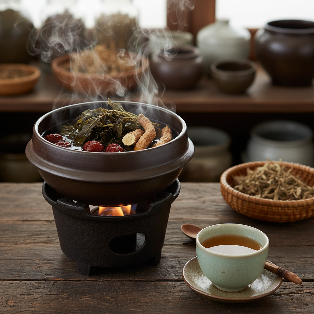 A: 물 2L 기준으로 잘 말린 부처손 10~20g 정도를 넣고, 물이 끓기 시작하면 약불로 줄여 30분에서 1시간 정도 은근하게 달여주세요. 감초나 대추를 한두 개 넣으면 쓴맛을 줄이고 약성을 조화롭게 만들 수 있습니다.