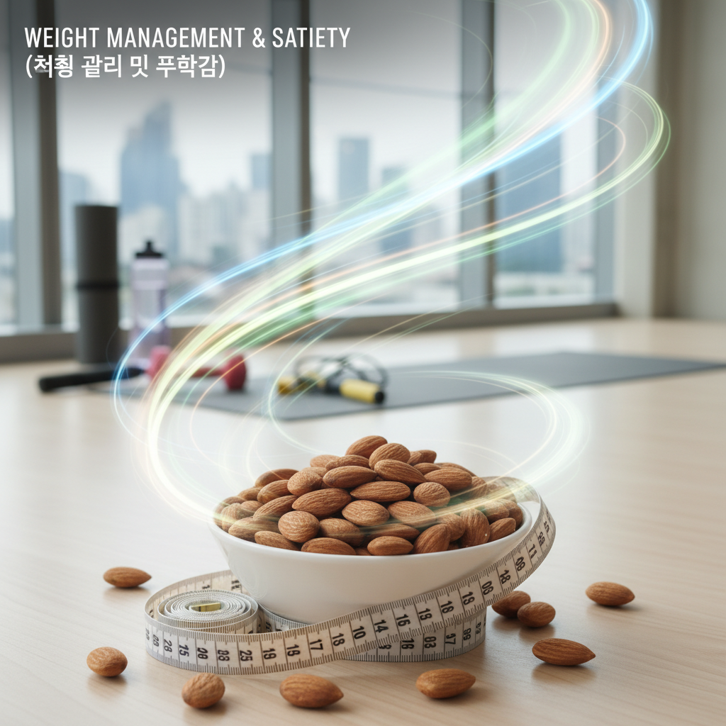 아몬드는 식이섬유와 단백질이 풍부해서 포만감을 오래 유지시켜줘요. 덕분에 과식을 줄이고 불필요한 간식 섭취를 막아 다이어트에 큰 도움을 준답니다. 아몬드의 지방은 체내 흡수율이 낮다는 연구 결과도 있어서, 적정량 섭취 시 체중 관리에 긍정적인 영향을 미쳐요.