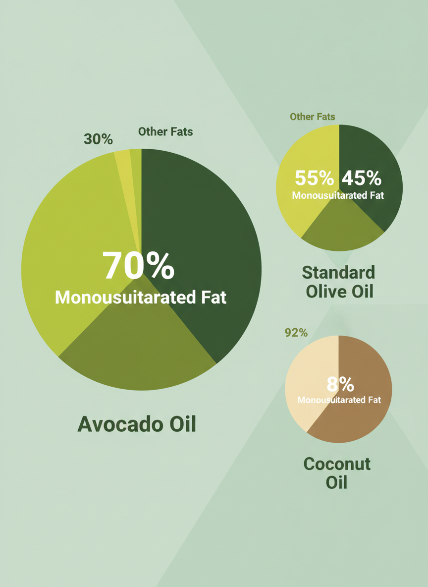 영양학적으로 보면 아보카도 오일의 약 70%는 불포화 지방산인 올레산(Oleic Acid)으로 구성되어 있습니다. 여기에 비타민 E, 루테인, 카로티노이드 등 강력한 항산화 성분이 포함되어 있어 우리 몸의 산화 스트레스를 줄여주는 훌륭한 역할을 합니다.