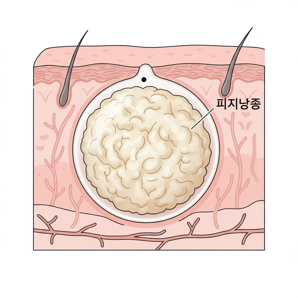 | 피지낭종 | 피부 아래에 생긴 주머니에 피지와 각질이 차오른 혹. 한가운데 작은 구멍(검은 점)이 보일 수 있음 | 염증이 생기기 전까진 안 아프지만, 짜면 하얗고 고약한 냄새가 나는 치즈 같은 물질이 나옴 |