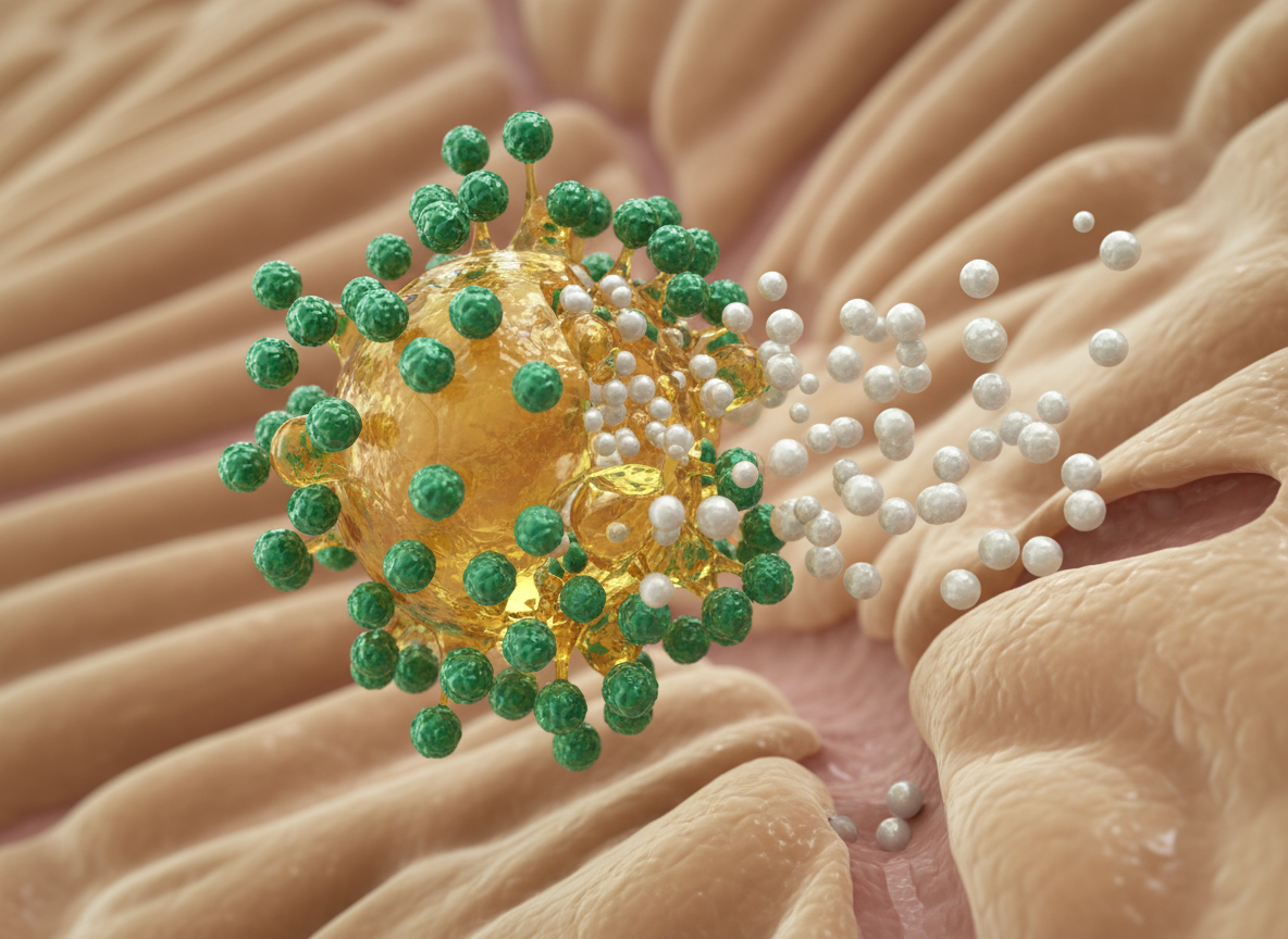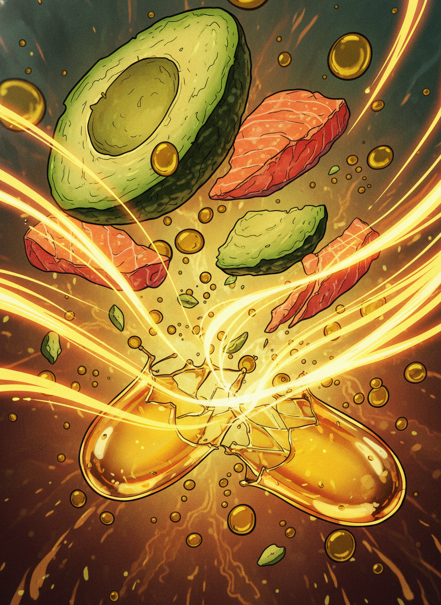 오메가3의 핵심 성분인 EPA와 DHA는 지방산, 즉 '기름'입니다. 우리 몸이 기름진 성분을 흡수하기 위해서는 담즙산이라는 소화액이 필요해요. 담즙산은 우리가 음식을 씹고 삼킬 때, 특히 지방 성분이 들어있는 식사를 할 때 활발하게 분비됩니다.