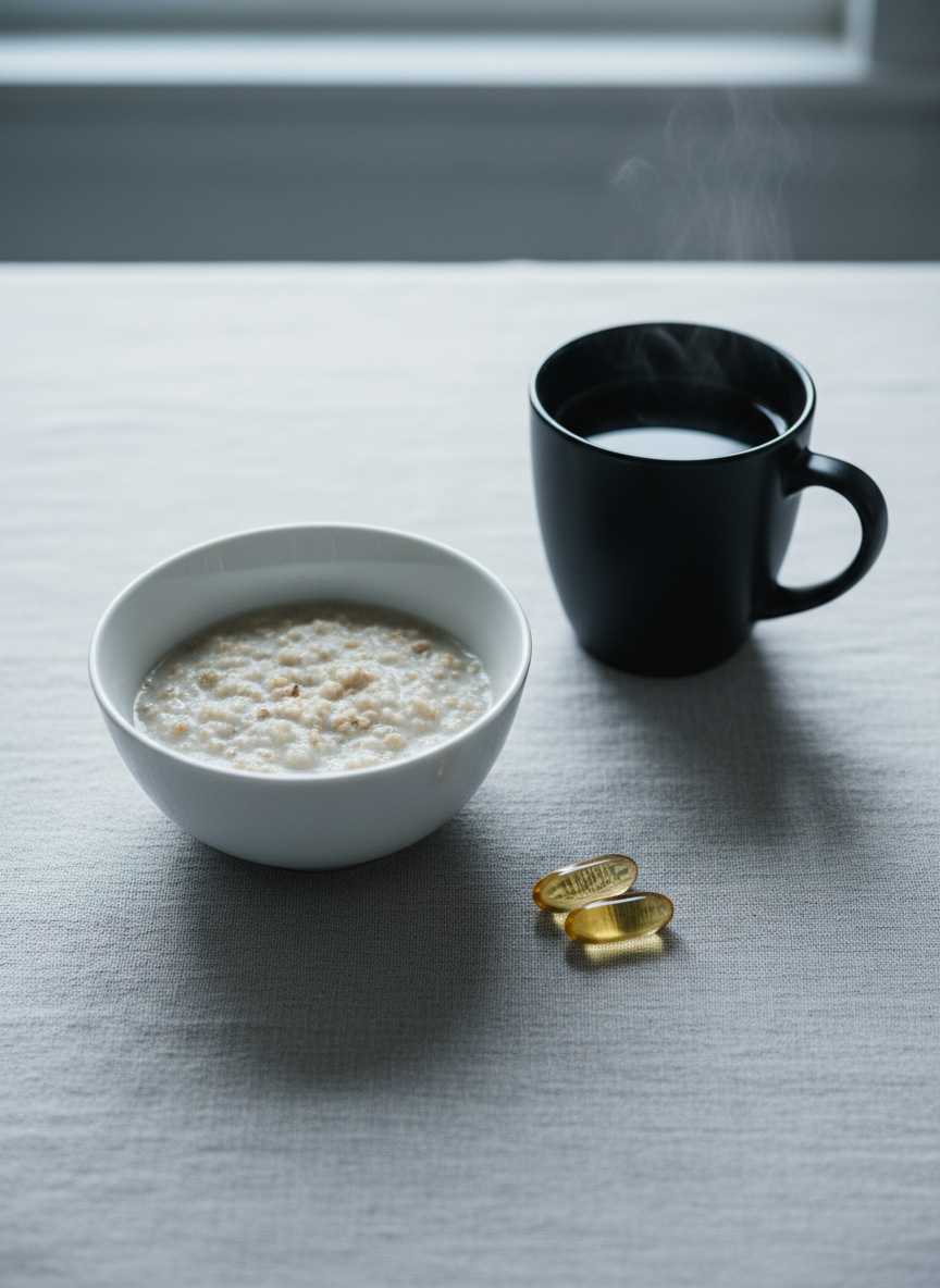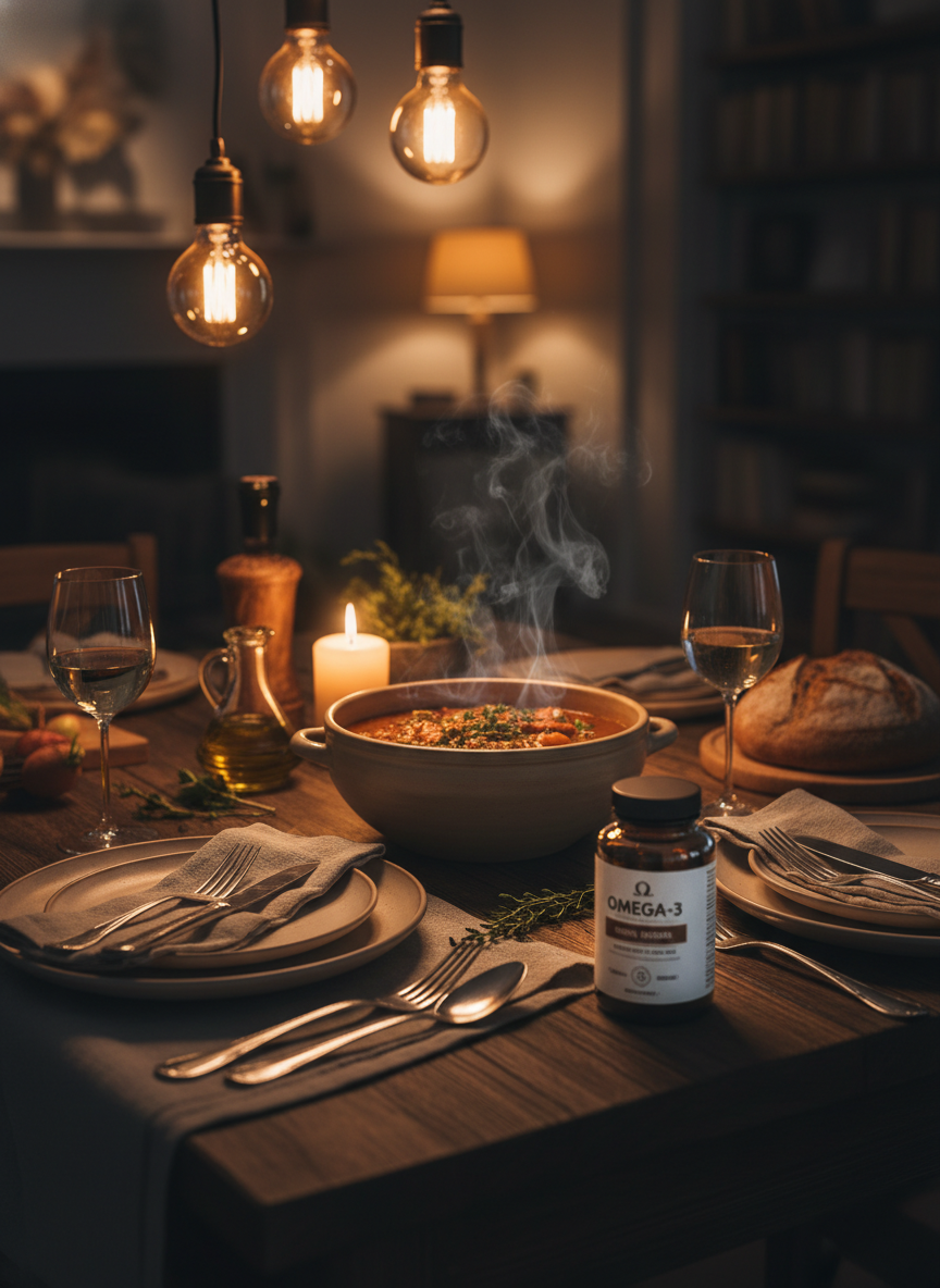 만약 저녁 식사를 평소에 아주 가볍게(과일이나 고구마 1개 등) 하시는 편이라면, 차라리 점심 식사 직후에 오메가3를 드시는 것이 영양학적으로 훨씬 이득입니다.