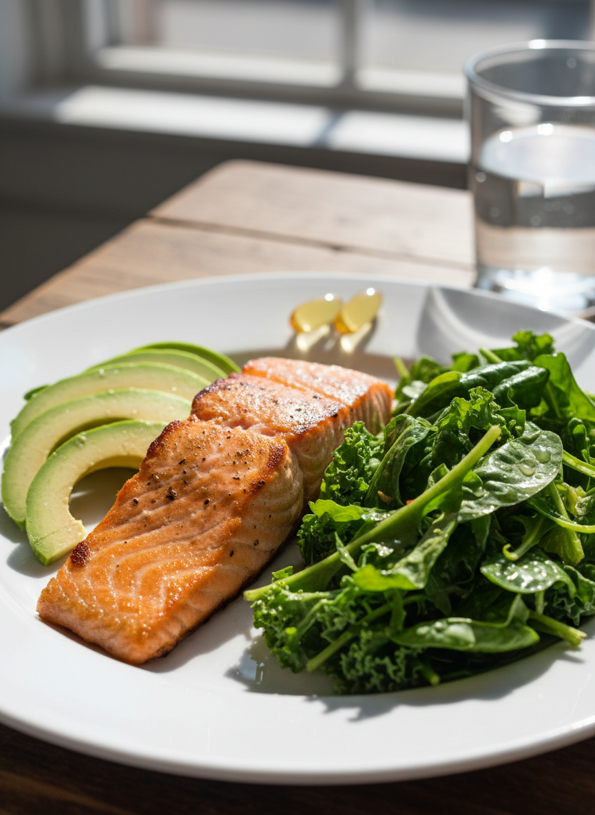 이때 식사 메뉴도 중요한데요, 샐러드만 가볍게 드실 때보다는 생선, 고기, 달걀 등 적절한 지방이 포함된 식사를 했을 때 흡수율이 비약적으로 상승합니다. 한 연구에 따르면, 지방이 포함된 식사 후에 오메가3를 섭취했을 때 공복 대비 흡수율이 최대 3배 이상 차이가 난다고 해요.