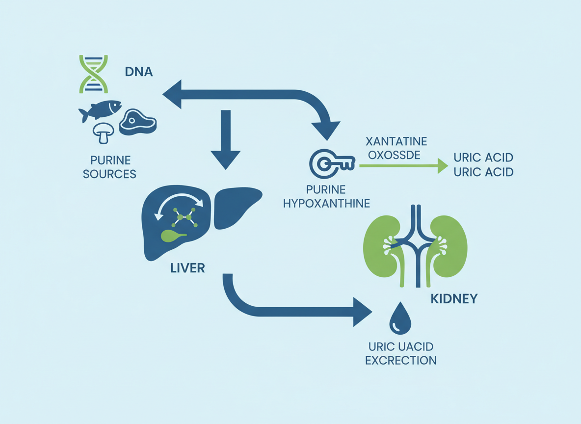 우리 몸에는 끊임없이 세포가 생성되고 소멸되는 과정이 반복돼요. 이때 세포의 핵산(DNA, RNA)이 분해되면서 생기는 물질이 바로 '요산(Uric Acid)'입니다. 요산은 평소에는 혈액에 녹아 있다가 신장을 통해 소변으로 배출되는 것이 정상적인데요. 문제는 이 요산이 너무 많이 생성되거나, 몸 밖으로 제대로 배출되지 않을 때 발생합니다.