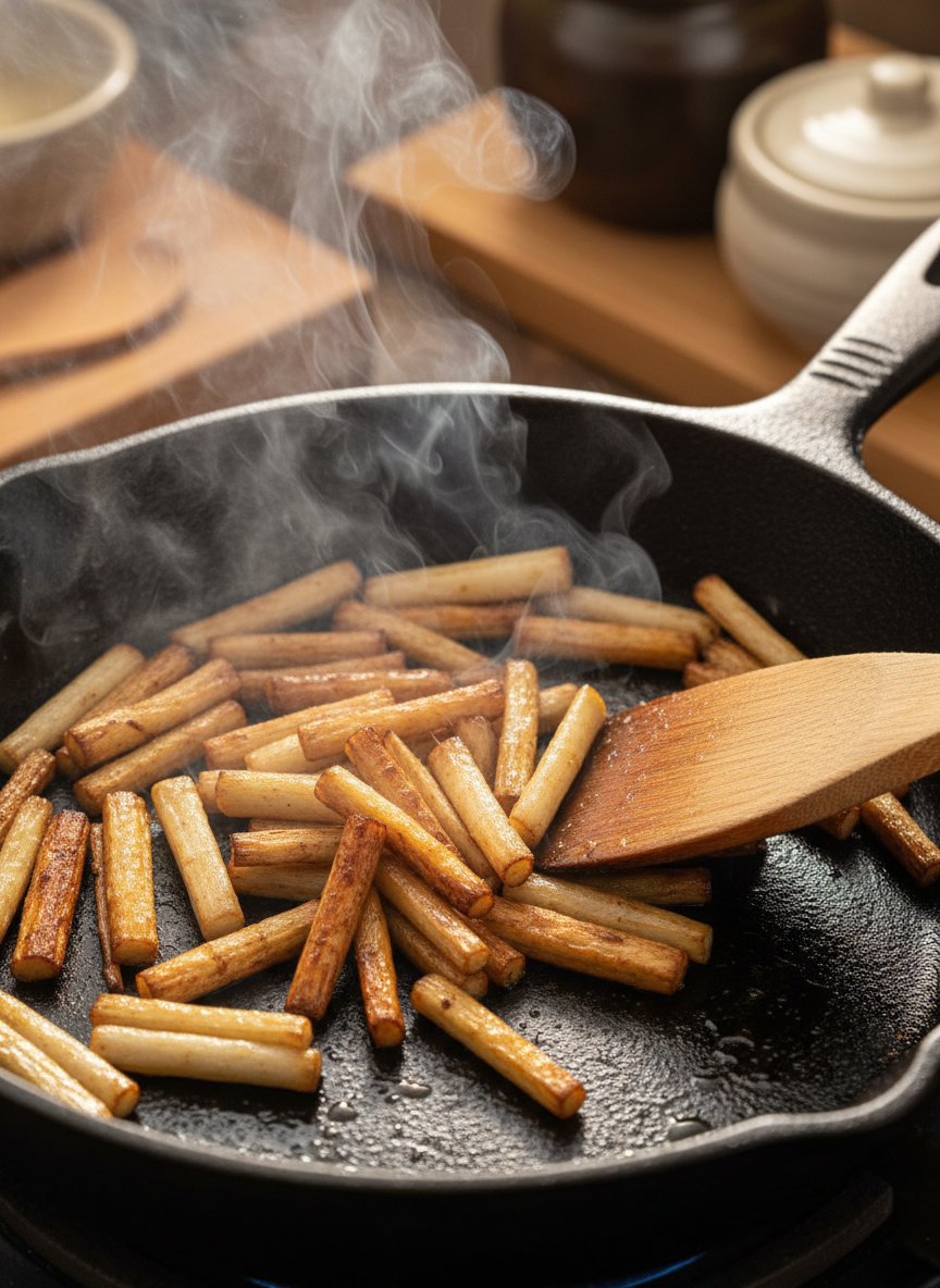 그렇다면 이 좋은 우엉차를 어떻게 마셔야 탈이 없을까요? 정답은 '로스팅'에 있습니다. 우엉을 잘게 썰어 햇볕에 말린 뒤, 프라이팬에 9번 덖고 식히는 과정을 반복하면 찬 성질은 중화되고 구수한 맛과 영양 성분은 배가됩니다.
