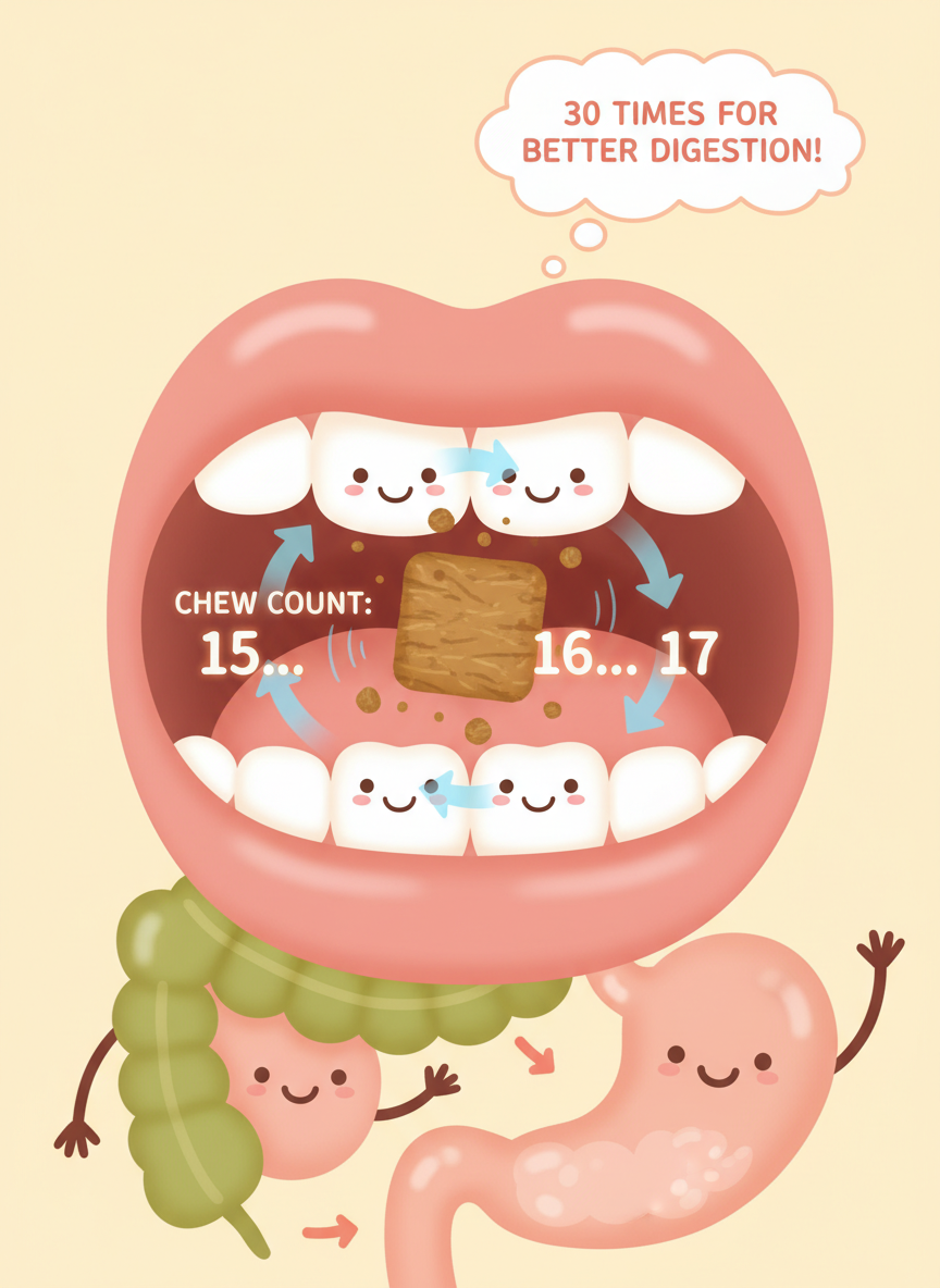 아무리 좋은 음식을 먹어도 식습관이 엉망이라면 밑 빠진 독에 물 붓기입니다. 위염 탈출을 위해서는 '무엇을 먹느냐' 만큼이나 '어떻게 먹느냐'가 중요합니다. 첫째, 음식을 입안에서 죽이 될 때까지 30번 이상 씹으세요. 1차 소화 과정을 입에서 끝내야 위장의 부담이 줄어듭니다. 둘째, 식사 도중 물을 많이 마시면 위산이 묽어져 소화력이 떨어지니 주의하세요.
