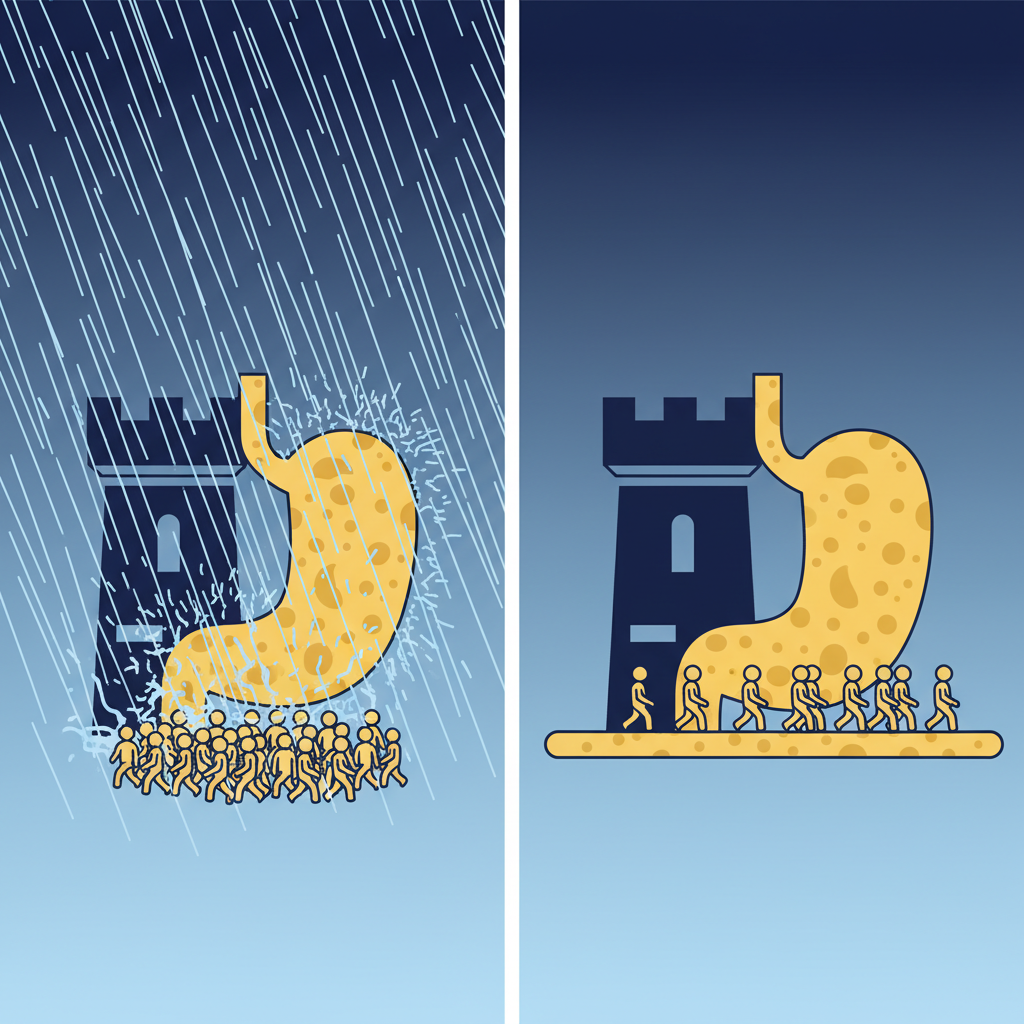 일어나서 미지근한 물 한 컵을 천천히 마시면, 밤새 쌓인 위산을 씻어내고 위장의 산도를 일시적으로 낮출 수 있습니다. 유산균은 산성에 매우 취약하기 때문에, 이렇게 '길을 닦아놓은' 상태에서 투입되었을 때 생존율이 비약적으로 상승합니다. 즉, '아침 공복'이 정답이 아니라 '아침 공복에 물을 마신 후'가 진짜 정답인 셈입니다. 캡슐 코팅 기술이 발달했다고는 하지만, 여전히 자연적인 방어막을 만들어주는 것이 가장 안전한 보험입니다.