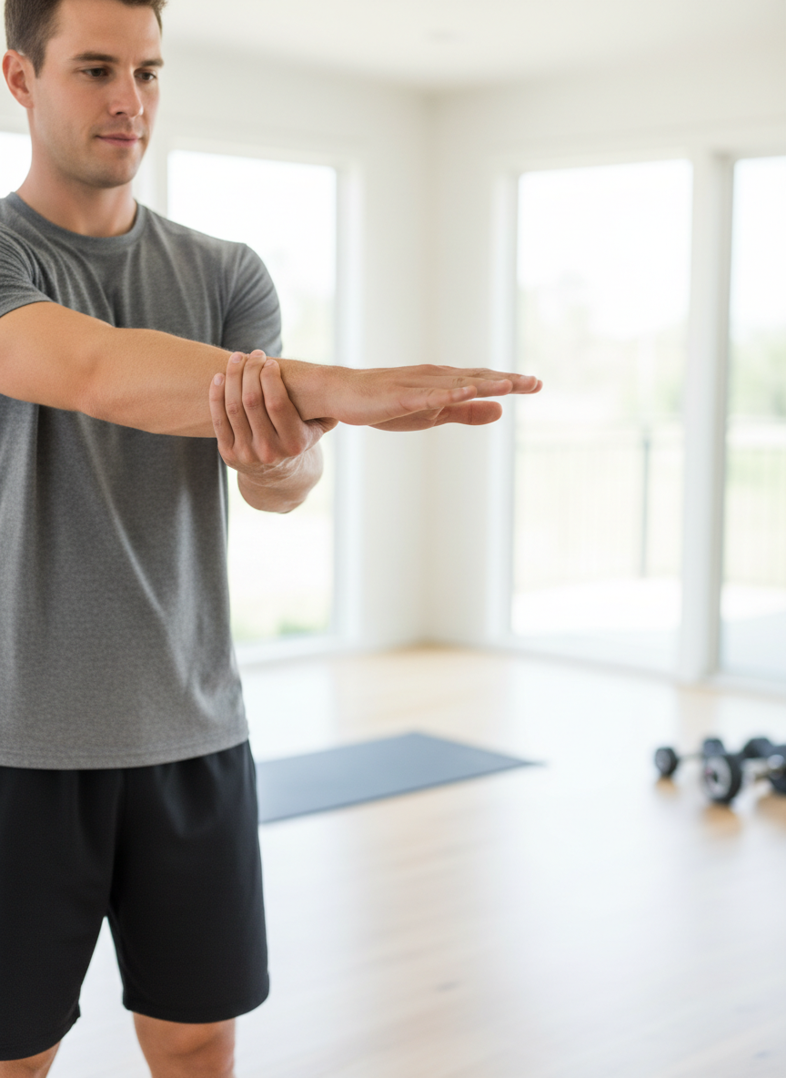 | 손목 신전근 스트레칭 | 팔을 앞으로 쭉 펴고 손바닥을 아래로 향하게 한 후, 다른 손으로 손등을 잡아 아래로 당겨줍니다. |