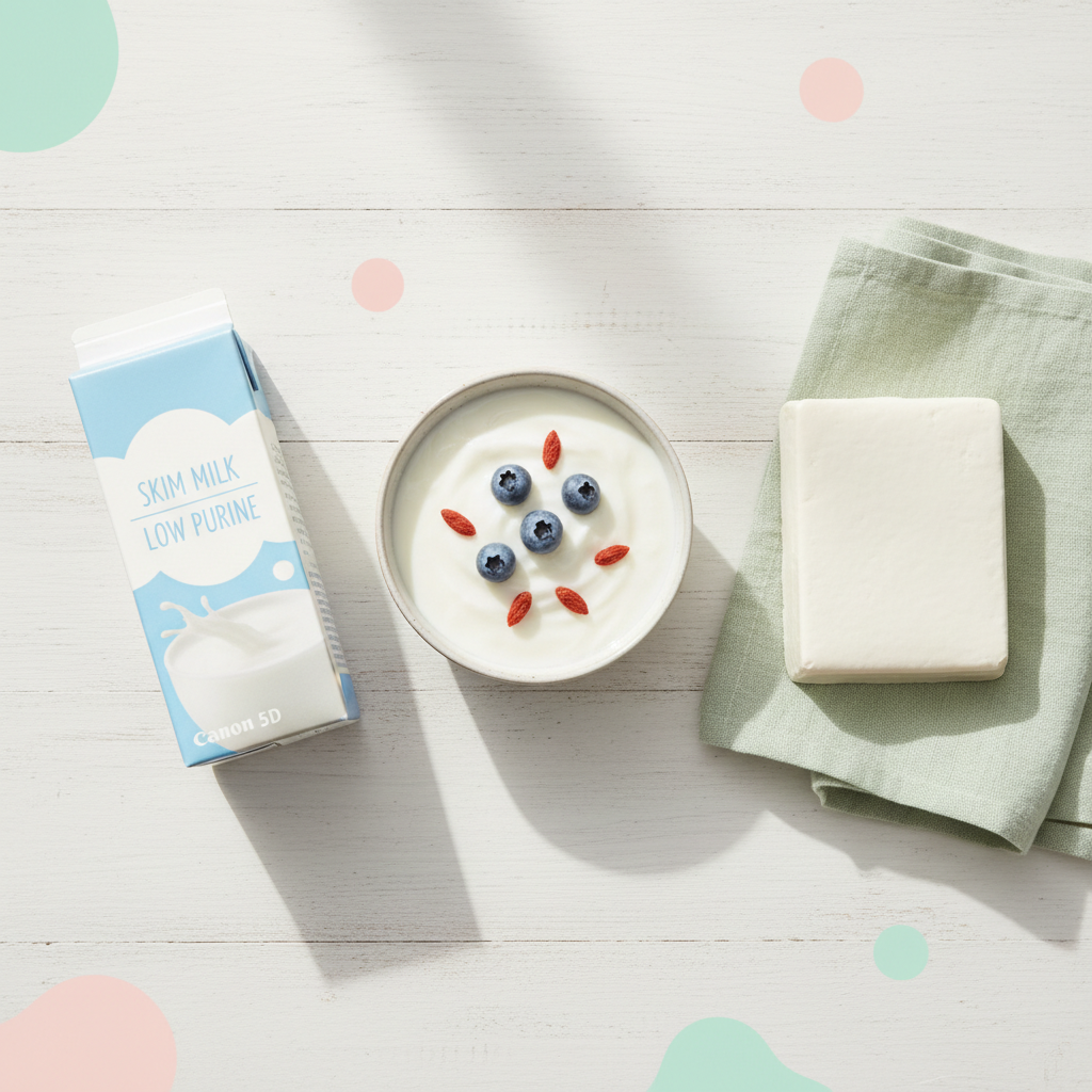 - 저지방 유제품과 채소를 가까이하세요: 요산 배출을 돕고 소변을 알칼리화하는 든든한 지원군입니다.